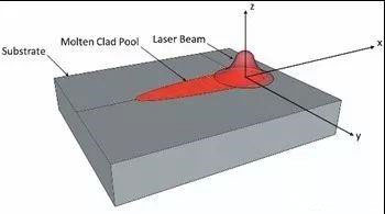 激光熔覆所需要的激光器功率要達(dá)到數(shù)千瓦級,這意味著上百萬束手持紅色激光束同時(shí)聚焦在不到一枚硬幣大小的區(qū)域。此時(shí)聚焦在金屬表面產(chǎn)生的熱量足以把基體熔化,對于鋼來講,表面溫度能夠達(dá)到2500~3000℃。針對不同的材料,在進(jìn)行表面熔覆時(shí)需要的熱量不同;但是對于同種材料來講,無論是采用激光熱源還是電弧熱源,都需要將母材加熱到熔化溫度,但是由于激光束是高度集中的熱源,因此其所需要的總能量要低于弧焊熱源。激光熱源只作用在需要的區(qū)域,而弧焊熱源中有很大一部分熱量要消耗在非加熱區(qū)域,所以在熔化金屬方面激光熱源更有效率 。簡單的講,電弧熔覆就像是探照燈,而激光熔覆就相當(dāng)于在必要的時(shí)候閃光提醒的激光束。與焊接相類似,激光熔覆時(shí)熔化的區(qū)域也叫作在熔池。